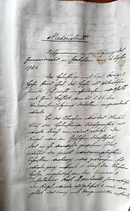 Aufgenommen in der Sitzung des Gemeinderates in Gochsheim den 2. September 1926 die Helmstange mit Kugel, Kreuz und Hahn stand schief; der Hahn als Wetterfahne konnte sich nicht mehr drehen, weshalb mit Gem. Beschluss vom 23.8.26 die Wiederinstandsetzung derselben angeordnet wurde. Bei der Abnahme war das Mantelblech der Helmstange durchgerostet, es wurde durch ein neues ersetzt. Die Kugel war von Geschossen durchlöchert. Des in ihr verwahrt gewesene Glas, welches die sämtl. Wiedereingelegte Schriften waren zerbrochen. Es wurde ganz entfernt u. durch die blecherne Hülse, angefertigt von dem Spengler u. Installateur Karl Bernhardt hier, ersetzt die Kugel wurde ausgebessert u. neu vergoldet, das Kreuz mit Stange musste instand gesetzt u. neu gestrichen werden. Der Hahn wurde wieder neu vergoldet. Die Arbeiten wurden von dem Dachdecker Georg Gradler von hier unter Mithilfe des Schlossers sonst Jäger, wohnhaft in Gochsheim, ausgeführt.